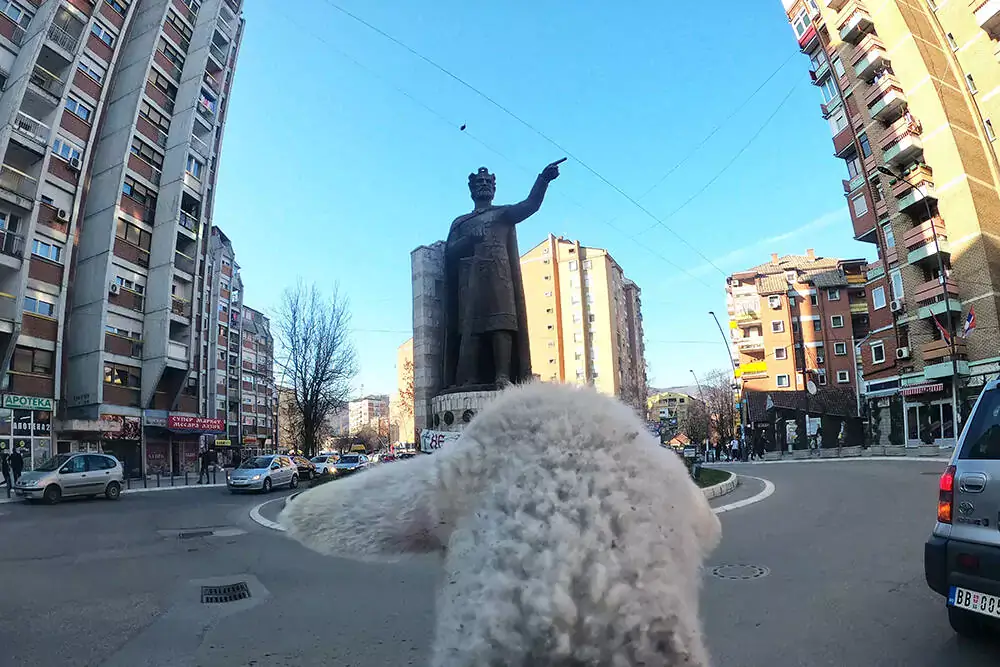 LAMB is a performance project that took place in Kosovo, from 27th of March to 3th of April 2021 (7 days; 150 km), in which Luka Cvetkovic carried and cared for a lamb from Jarinje (ethnically Serbian village in the North) to Kacanik (ethnically Albanian village in the South of Kosovo), where it continued living with an Albanian-Kosovar farmer. The performance was documented from the lamb’s perspective, as the main idea was to raise the question of a new subjectivity versus pre-existing narratives, concepts, and projections and thus bring into discussion a new, unpoliticized, and uncorrupted view in order to gain an understanding of reality, or how reality is performed onto us, respectively. This view can serve as a starting point to think events outside necessity and predictability, perspectives not situated in trauma subjectivity or inherited antagonisms, outside the need of human subjectification; events that decenter the human subject and offer ways of forming contingently new relations to the being of other.